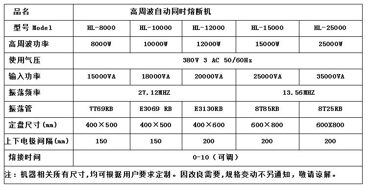 1.高周波同步熔斷機又稱高周波同時熔斷機、熔斷機、高周波同步裁斷機、高周波裁斷機。高周波熔斷機需塔配專用的高周波熔斷模具,才能達到熔接裁斷;